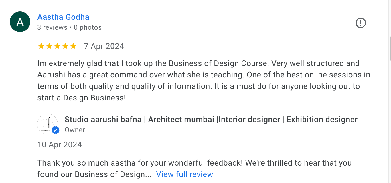 Master the essentials of running a successful design business — from client meetings and defining your signature style to finance management, media visibility, and brand building.Includes self-paced video lessons, monthly live Q&A with Aarushi, lifetime access, and completion certification.